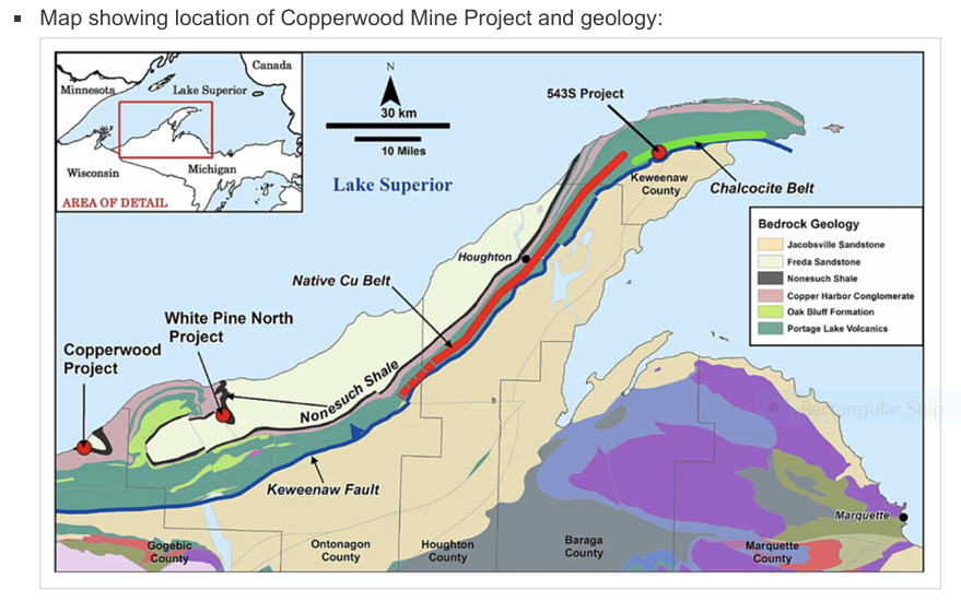 Highland Copper talks about developing a MINING DISTRICT in this area, encompassing lands on both ends of the Porcupine Mountains Wilderness State Park, including the “White Pine North” project at the historic White Pine mine and mill site, 21 miles east of the Copperwood project. The White Pine site could potentially be used for milling ore and the permanent storage of environmentally hazardous mine waste. The White Pine site includes enormous historic tailings basins and contaminated brownfields; the tailings basins are so large they can be seen from space. The White Pine project is stalled, due to liability and financing concerns.