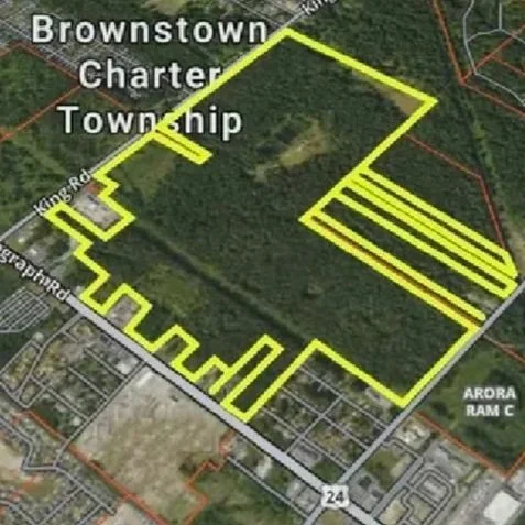 See map below (a little confusing in its orientation) for the location of the site, which is bounded by Telegraph Road (U.S. 24) on the east side, King Road on the south side and Sibley Road on the north side (unlabeled) with property boundaries highlighted in yellow: